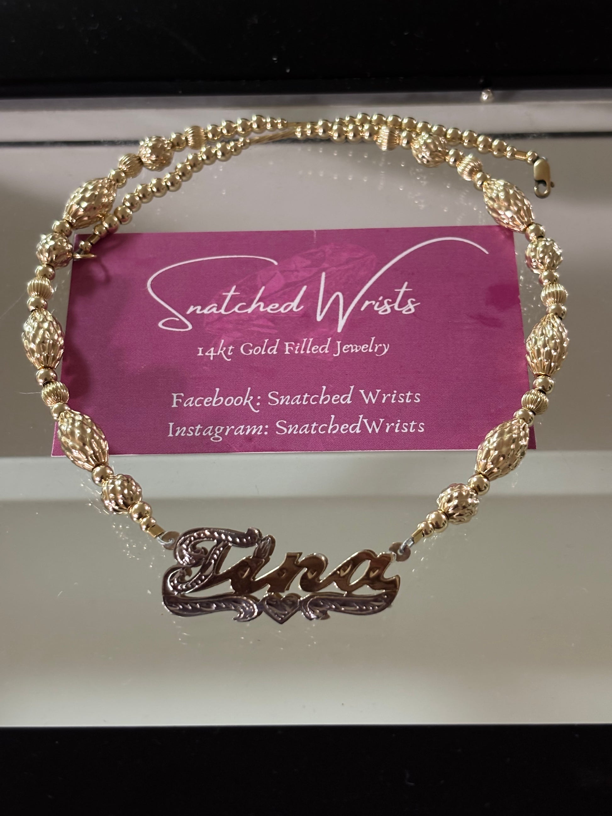10K Real Gold Double plated nameplate with All Gold fancy bead attachment.
