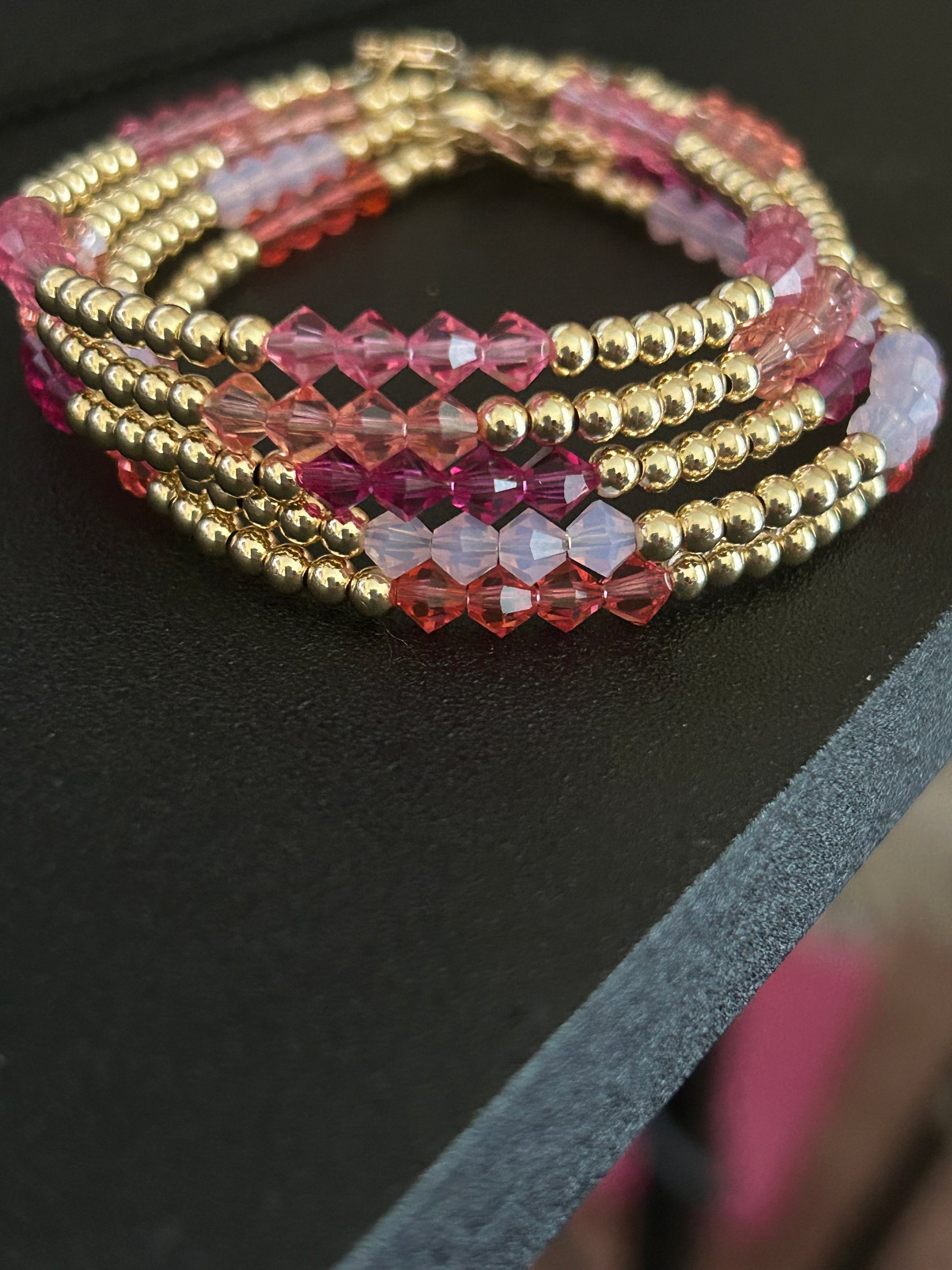 5 Stackable bracelets in 5 different shades of pink using 4mm Swarovski crystals