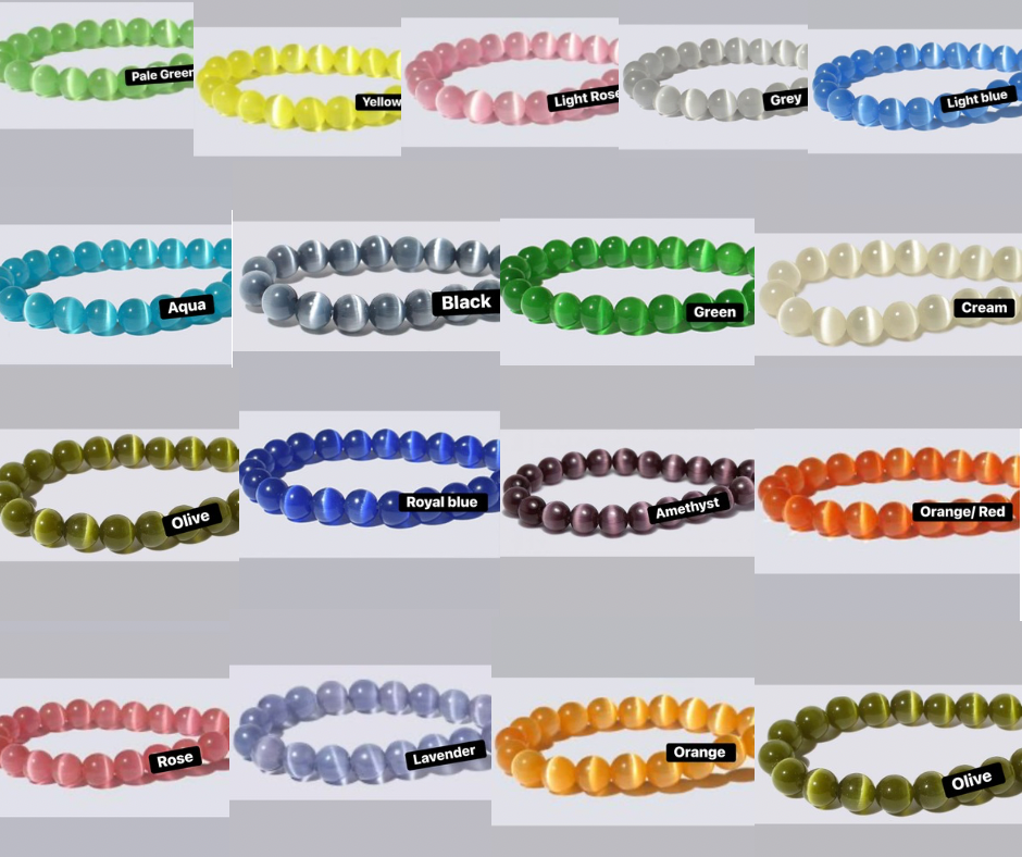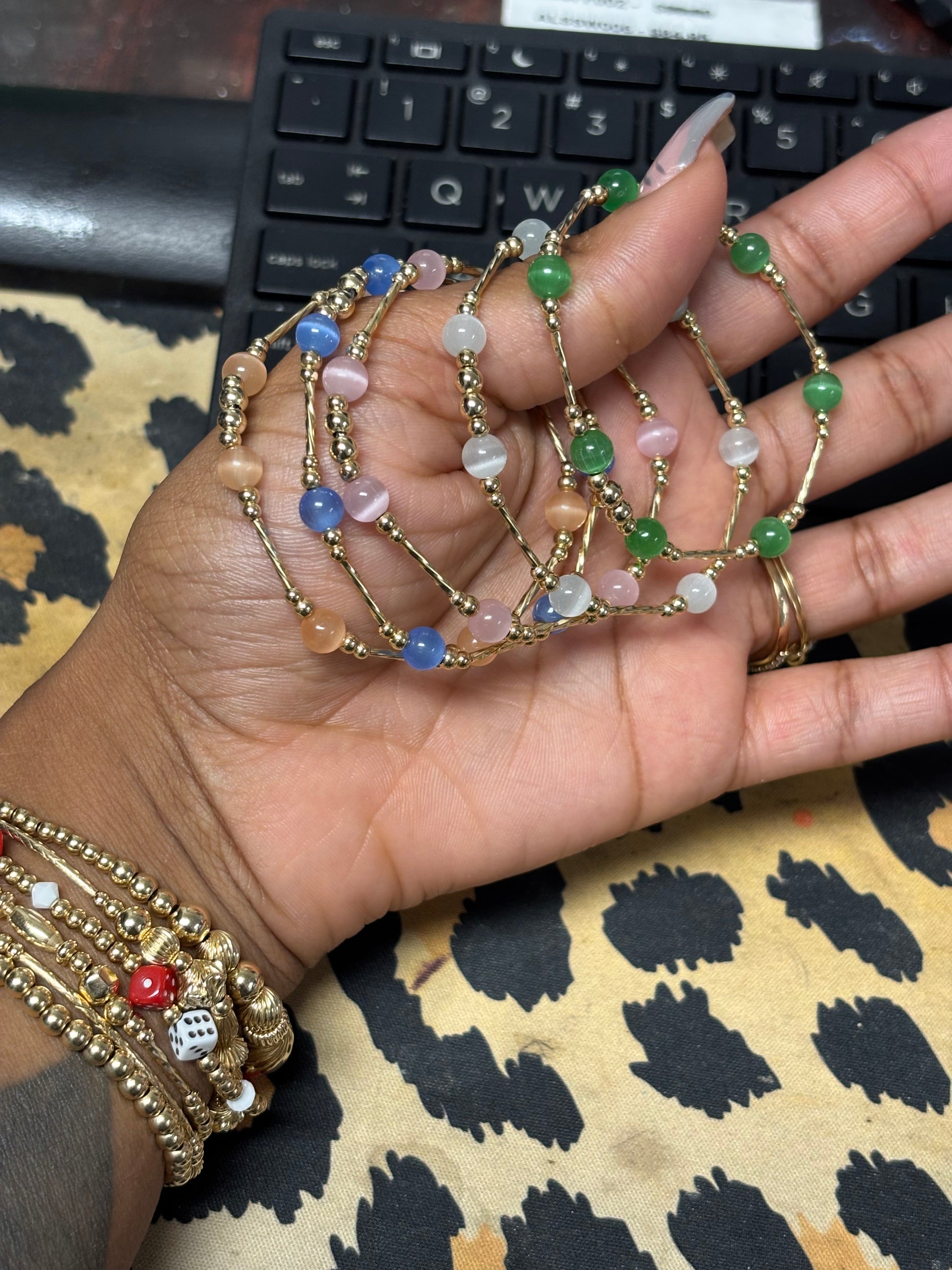 Handcrafted 5-stack stretch bracelet set made with shimmering Cat Eye beads. Tarnish-free, waterproof, and designed for everyday wear. Choose gold or silver bar accents and customize your bead colors in the notes box at checkout