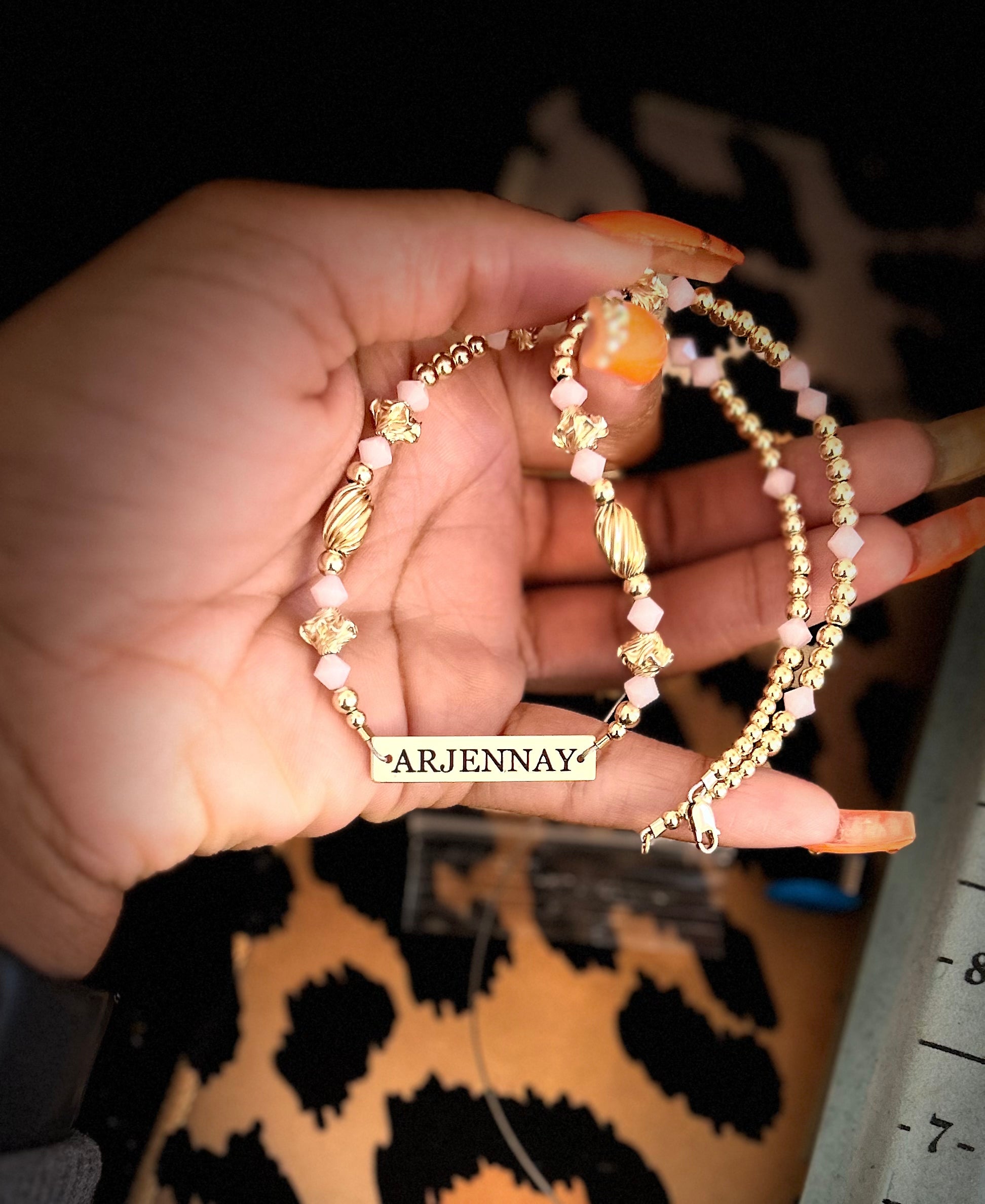 This elegant necklace features a custom-engraved gold-filled bar with your choice of gold or silver beads and stunning Swarovski crystals. Don't forget to specify your desired name and color in the notes section at checkout.