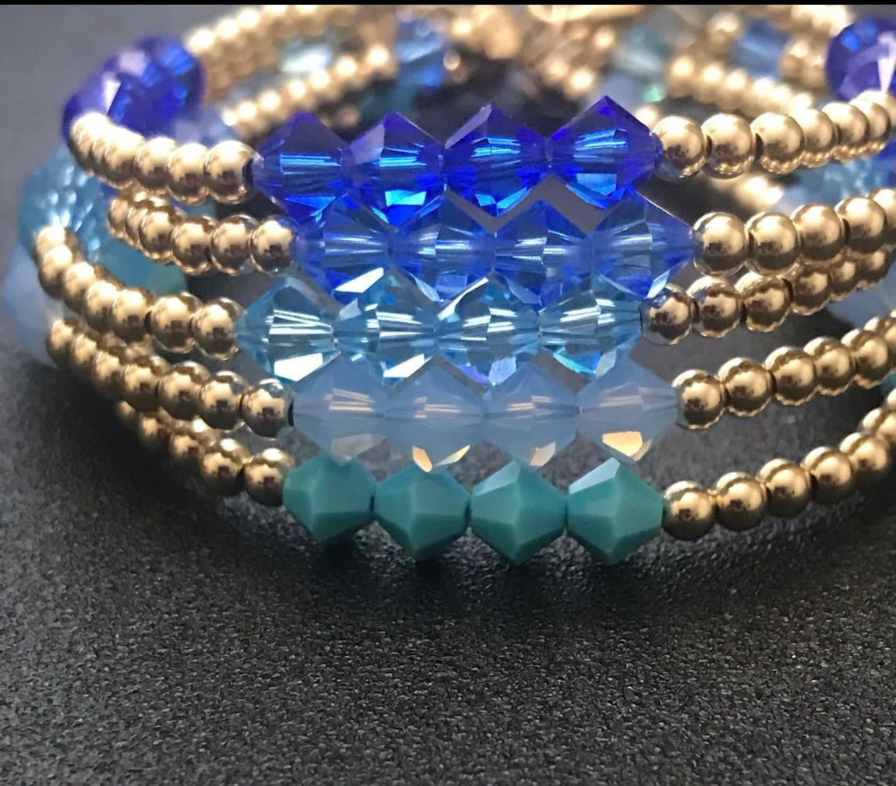 Our 5mm Swarovski crystals in Aquamarine, Turquoise, Light Sapphire, Majestic Blue, and Caribbean Blue Opal. Available in gold or silver for a touch of effortless elegance.