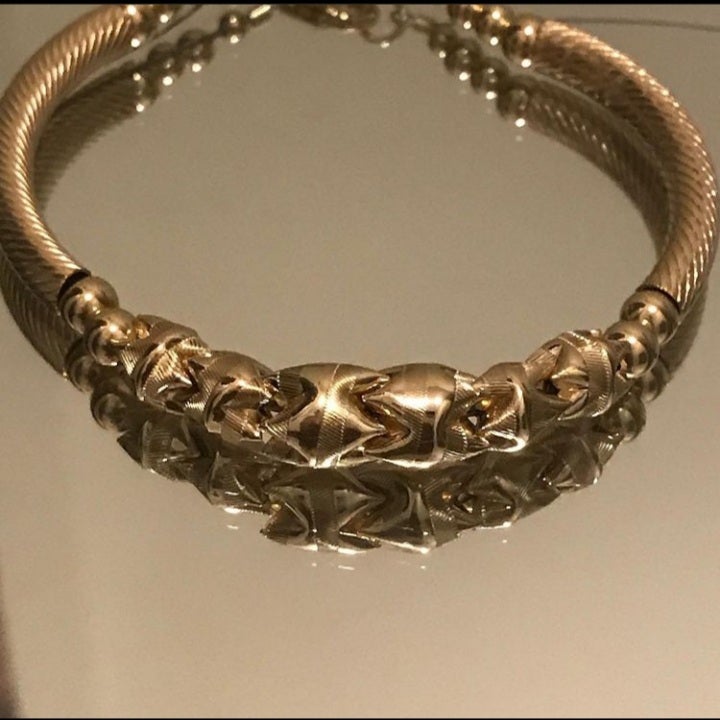 Interlock designer beads beaded on hard wire with pattern bangle tubes.